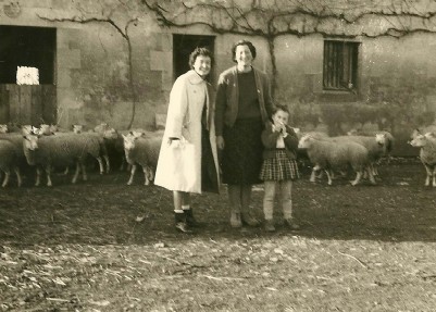 Paulette et moutons devant les écuries